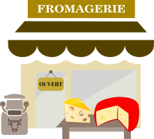 Le fromager vend des produits laitiers. Les clients achètent du fromage (du camembert, du gruyère), de la crème, du beurre, du lait et des yaourts.